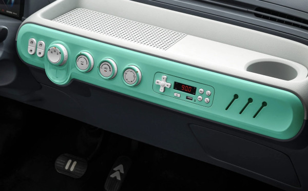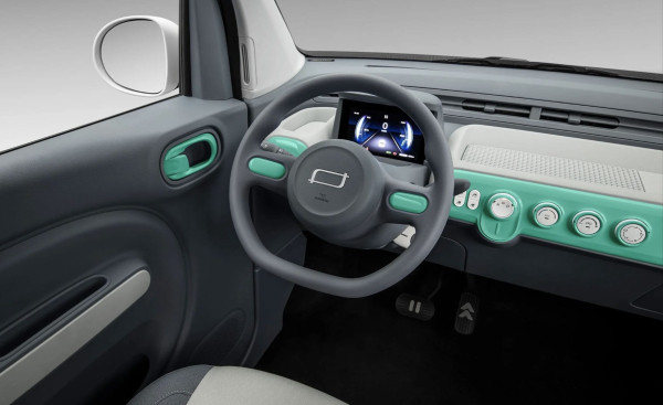 У машинки мультяшный внешний вид и большие боковые двери — от одной колесной арки до другой. Задний ряд кресел выглядит весьма аскетично, однако двое взрослых здесь усядутся, пусть и с минимальным комфортом. В салоне авто присутствует всего один экран – ему отведена роль приборки. Он же транслирует изображение с камеры заднего вида.